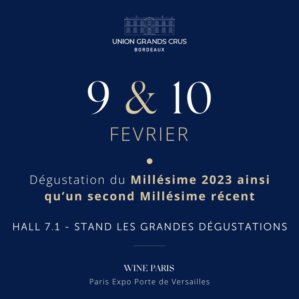 L’Union des Grands Crus de Bordeaux est ravie de vous inviter à la découverte de son Millésime 2023 ainsi qu’un second Millésime récent ! Plongez dans l’univers des Grands Crus et laissez-vous séduire par plus de 100 grands vins. Découvrez toute la diversité, l’élégance et la richesse issues des appellations les plus emblématiques de Bordeaux. Pour rappel, vous devez être muni d'une entrée au salon Wine Paris 2026 afin de pouvoir accéder à notre dégustation.